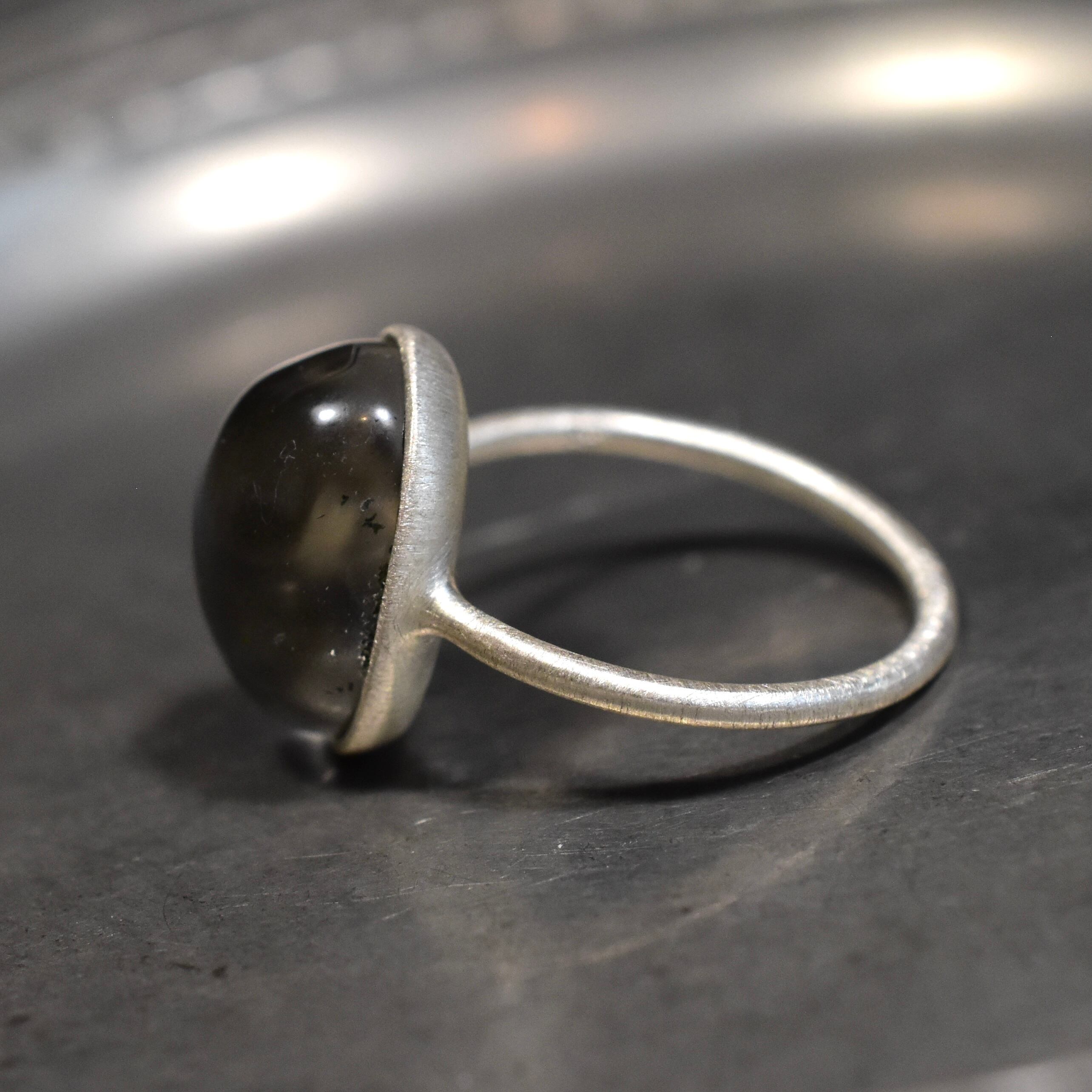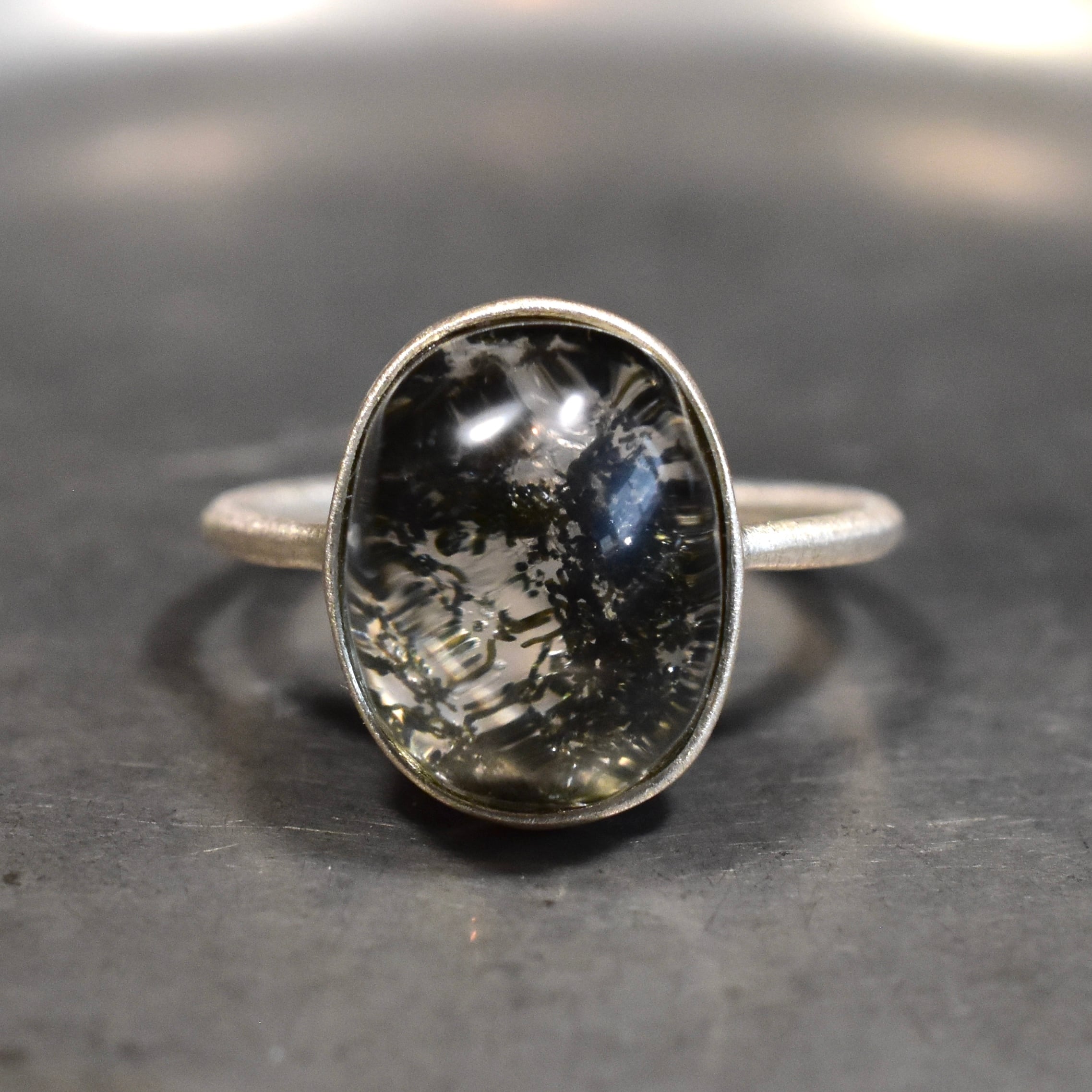 カボションのぷっくりした石用のデザインで、石の立体感や中のインクルージョンを最大限に楽しめます。覆輪なので洋服などへの引っかかりが少ないのも特徴です。