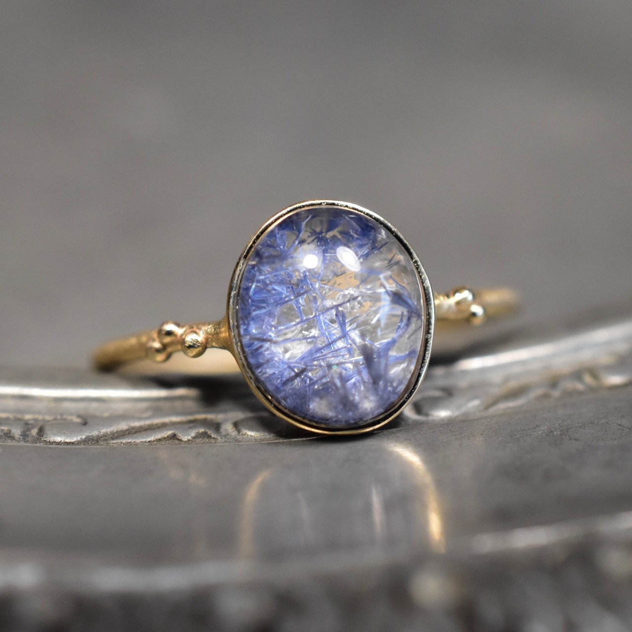 カボションのぷっくりした石用のデザインで、石の立体感や中のインクルージョンを最大限に楽しめます。覆輪なので洋服などへの引っかかりが少ないのも特徴です。